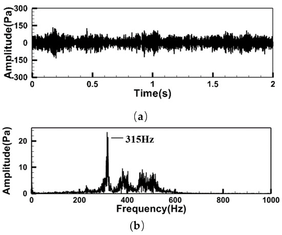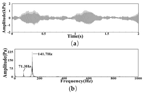 To further analyze the accuracy and universality of the above results, a verification analysis was conducted on the experimental and numerical calculation results of the swirl model combustor. The Empirical Mode Decomposition (EMD) method was also used to process the pressure fluctuation signals, thereby decomposing the complex information of multi-physical processes within the combustion chamber. Figure 19 shows the time-series signal and spectrum diagram of pressure fluctuations inside the combustion chamber under this experimental condition. From the diagram, it can be observed that under this condition, the combustion is in a stable state, and there exists a dominant fluctuation frequency with low amplitude.