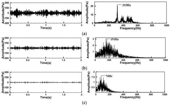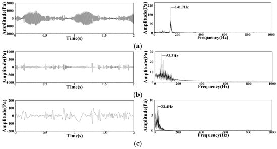 Time domain and frequency domain of each component of A02 operating condition DP: (a) time domain signal of 1st IMF (left) and frequency domain signal of 1st IMF (right); (b) time domain signal of 2nd IMF (left) and frequency domain signal of 2nd IMF (right); (c) time domain signal of 3rd IMF (left) and frequency domain signal of 3rd IMF (right).