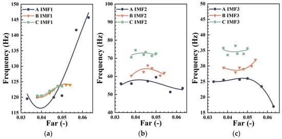 Changes in the main frequency of pulsation of DP components at different operating conditions: (a) 1st IMF; (b) 2nd IMF; (c) 3rd IMF.