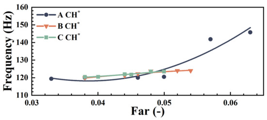 In this paper, the CH* filter is used in conjunction with a phototube to collect information on heat release rate fluctuations. After statistical analysis of the dominant fluctuation frequencies of CH* under all working conditions, the changes in the dominant fluctuation frequencies of CH* at three different air mass flow rates are shown in Figure 10. It can be seen from the figure that the dominant fluctuation frequency of CH* under high fuel-to-air ratio FI states gradually decreases as the fuel-to-air ratio decreases and stabilizes around 120 Hz in the CI state; comparing the dominant fluctuation frequency of CH* with the dominant fluctuation frequency of the 1st IMF for DP in Figure 8a, it is found that the frequency changes in both are consistent, leading to the inference that the 1st IMF fluctuation component of DP can represent the characteristics of changes in heat release rate fluctuations.