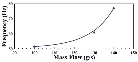 Following the above-mentioned method, the results of the changes in the dominant fluctuation frequency caused by flow field structure fluctuations in other working conditions are shown in Figure 12. It can be observed that as the inlet air mass flow rate increases, the dominant fluctuation frequency of DP in the cold state gradually increases; at the same time, this frequency change deviates from a linear increase with the inlet air mass flow rate. The changes in the dominant frequency of the cold state DP under different inlet airflow rates are approximately consistent with the changes in the dominant fluctuation frequency of the 2nd IMF mentioned above, indicating that the 2nd IMF contains macro fluctuation information about the cold state flow field structure at that specific airflow rate.