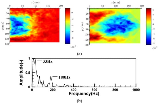 In the combustor, there exist complex fluctuation characteristics. This paper employs the Proper Orthogonal Decomposition (POD) method to decompose the results of numerical simulations. Due to the axisymmetric structure of the combustor, for the convenience of data analysis, only the two-dimensional map distributed along the axial direction of the combustor is recorded. As shown in Figure 13a, the diagrams represent the first two orders of POD decomposition pulsation characteristics. On the left is the result of the first-order mode, where a distinct axial pulsation characteristic along the central axis of the combustion chamber can be observed. On the right is the result of the second-order mode, primarily characterized by the pulsation of flame tail edge curling upstream. In Figure 13b, which presents the spectrum of the first-order mode of the POD decomposition of the heat release field within the combustion chamber, it is evident that there is a dominant fluctuation frequency around 33 Hz and another around 180 Hz. Based on the analysis presented earlier, the fluctuation characteristic at 33 Hz could be related to the phenomenon of flame detachment, while the fluctuation characteristic at 180 Hz should be associated with the fluctuations in the flame’s heat release rate.
