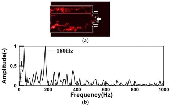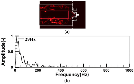 To further understand the main fluctuation characteristics in the region near the central axis, POD decomposition was performed on the local area of the heat release field as shown in Figure 16a, and its first-order mode spectrum is displayed in Figure 16b. From the spectrum, it can be observed that the dominant fluctuation frequency in this area is 29 Hz, which is quite consistent with the detachment frequency mentioned earlier, indirectly verifying that the 3rd IMF fluctuation component of DP can represent the fluctuation characteristics of the flame detachment phenomenon. There are many reasons for the occurrence of this flame surface shedding, including the stretching of the flame surface due to the action of swirl shear on the mainstream air, the uneven distribution of air density caused by pressure fluctuation changes further feeding back to the pressure fluctuation mechanism, making the flame surface discontinuous, and the effect of recirculation zones on the flame surface, among others.