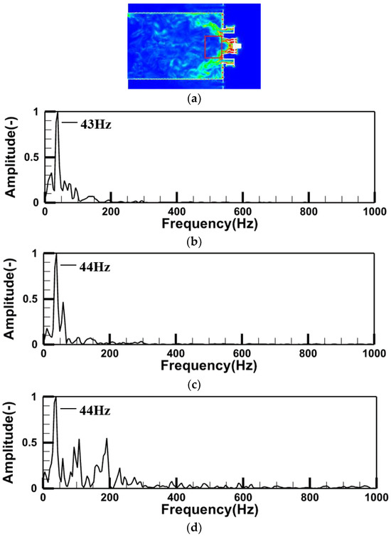 To further explore the characteristics of macro fluctuations in the cold state flow field structure, Large Eddy Simulation (LES) calculations were conducted on the centrally swirler stage combustor. Since large-scale vortex structures might be generated by swirling action, POD analysis was applied to the vorticity field, criterion vortex structure, and Q criterion vortex structure near the central axis at the outlet of the swirler, as shown in Figure 17a. The first-order mode spectrum diagrams are shown in Figure 17b–d. From these, it can be seen that all three different vortex structure identification methods exhibit a dominant fluctuation frequency around 44 Hz. It is believed that this macro fluctuation structure is caused by the PVC structure formed when the inlet air passes through the swirl vanes and is subjected to swirl shear. Thus, it is verified that the 2nd IMF fluctuation component of DP contains the PVC fluctuation characteristics of the cold state flow field in the swirl combustion chamber under that airflow rate.
