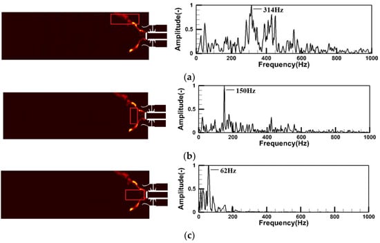 Based on the conclusions drawn from the centrally swirler stage combustor, each order component of the EMD decomposition can correspond to a certain physical characteristic. Figure 21 shows the spectrum diagram obtained from POD processing of specific local areas in the heat release field and cold state vorticity field calculated numerically. The 1st IMF represents the fluctuation characteristics of the heat release rate, mainly reflected in the dominant fluctuation frequency of regions undergoing intense chemical reactions. Therefore, POD decomposition was performed on the heat release field in the flame shear layer area as shown in the left image of Figure 21a, with its first-order mode spectrum shown on the right. It can be seen that there is a dominant frequency near 314 Hz, which is quite close to the 315 Hz dominant fluctuation frequency of the 1st IMF. This further verifies that the 1st IMF component can somewhat represent the fluctuation characteristics of the heat release rate in the swirl combustion chamber. Similarly, local POD was performed on the cold state criterion vortex structure field and heat release field containing large-scale PVC vortex structures, also yielding spectrum diagrams with a clear dominant fluctuation frequency for both, as shown on the right in Figure 21b,c, corresponding to the cold state characteristics and flame detachment fluctuation characteristics of the 2nd IMF and 3rd IMF, respectively.