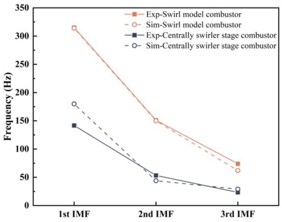 Figure 22 shows the dominant frequencies of each order component for both the centrally swirler stage combustor and the swirl model combustor under experimental and simulation results. It can be observed from the figure that as the order increases, the dominant frequency gradually decreases for both types of combustion chambers, and the numerical calculation results are in good agreement with the experimental results, verifying the accuracy and universality of the EMD components corresponding to different physical characteristics.
