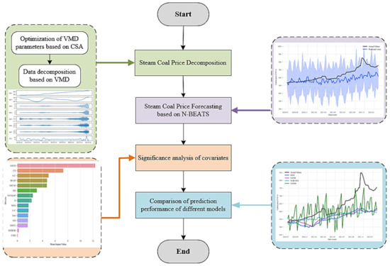 Considering the thought of decomposition and integration as well as the data-driven notion, this paper proposes a relevant coal price forecasting framework to complete interval forecasting and the importance analysis of drivers. As shown in Figure 1, first, this paper improves VMD using the CSA algorithm, obtaining CSA-VMD to decompose coal price sequences; then, this paper uses N-BEATS to process each subsequence and integrates all results to obtain the point forecasts of coal prices; next, this paper applies quantile regression to process the prediction from the previous step to achieve interval forecasts; finally, this paper uses the MIV algorithm to analyze the influence of drivers on coal prices.