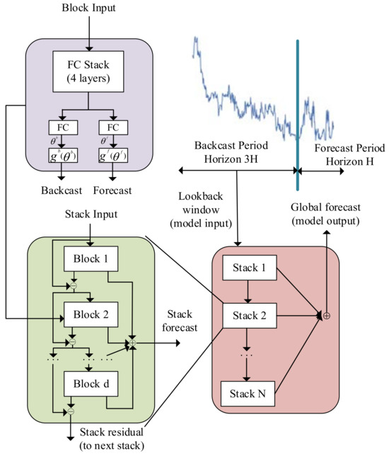 As a novel model for interpretable time series forecasting, N-BEATS can train quickly on multiple time series of multiple tasks, and successfully deliver and share personal learning with as little prior knowledge as possible [35]. This paper adopts N-BEATS to accomplish point forecasting of coal prices due to the generality and superiority of the model.