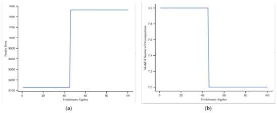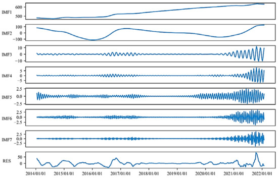 Variational modal decomposition (VMD) is a variational method for decomposing signals [34]. The core of VMD can be summarized in three steps: (1) determining all sub-signals’ number and constructing the constrained variational problem to assess the bandwidth of a mode; (2) introducing an augmented Lagrangian function to convert the previous problem into an unconstrained one, focusing only on finding a solution for the saddle point; (3) constantly updating each component and the central frequencies until the iterative constraints are satisfied to obtain the saddle point, thus obtaining the valid decomposition components. The non-stationary and non-linear coal price sequences are decomposed into -modal components , . More details can be found in Dragomiretskiy and Zosso [30].