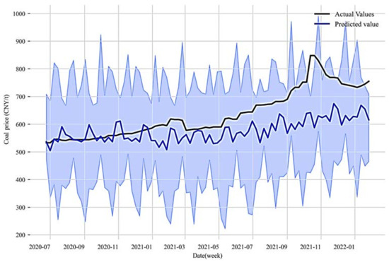 Point and interval forecasting based on VCNQM. Note: the blue shaded area depicts the interval forecasting of coal price at a confidence level of 90%.