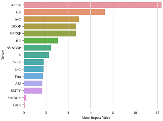 Figure 8 illustrates the importance of each driver to coal prices, ordered by the absolute value of MIV from top to bottom. In particular, the A-share power industry index, with an MIV of 12.3566, has the greatest degree of influence on the price of coal in China, followed by the coal industry index, with an MIV of −7.2830. Then, there is the AUD/CNY exchange rate, the Daqing oil spot price, and the Newcastle power coal spot price in Australia, each with an MIV of −4.9466, 4.7000, and −4.6765, respectively. As a result, this paper concludes that the five factors mentioned above have a significant impact on coal prices, while the MIVs of the coal mining industry index and the overnight Shanghai interbank offered rate are 0.0710 and −0.2257, respectively, indicating the smallest degree of impact on coal prices and can therefore be ignored. Because most of China’s coal is used for thermal power generation, the A-share power industry index directly affects coal demand, which in turn affects coal prices. The coal industry index directly influences the supply of coal and thus the price of coal. Oil, as the main substitute for coal, has a direct impact on coal prices due to its price fluctuations. Since Australia was the primary supplier of China’s coal imports in the past, the AUD/CNY exchange rate and the Newcastle power coal spot price in Australia directly influenced China’s coal supply and thus domestic coal prices.