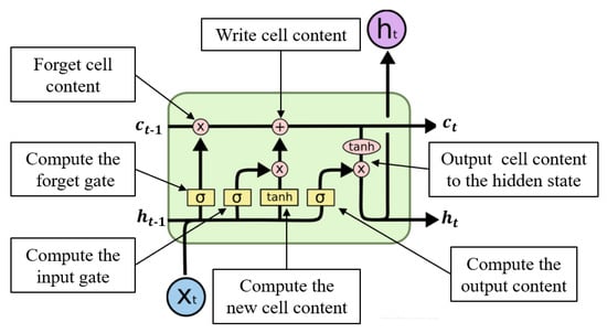 LSTM is a variant of the recurrent neural network (RNN) that addresses the challenge of long-term dependencies. It incorporates three gating mechanisms, namely forget, input, and output gates, in addition to the memory function of the RNN []. The LSTM architecture comprises one tanh layer and three sigmoid layers, as illustrated in Figure 1.