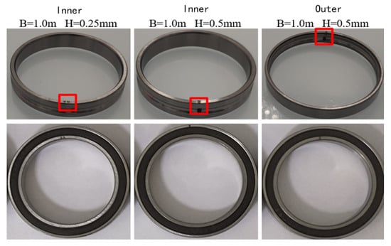 A defective bearing was created during the experiment by using a laser to produce a specific defect at a designated location. The defect’s width and depth were denoted as B and H, respectively. Ultimately, two bearings with defective inner rings and one bearing with a defective outer ring were obtained. Figure 4 illustrates the defect location and the reassembled bearing.