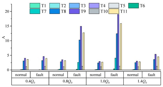 Figure 5 reveals that the amplitudes of the 11 time-domain characteristics differ. However, the time-domain characteristic amplitudes of the 11 normal bearing signals exhibit a trend of 1.0Q0 < 0.8Q0 < 1.4Q0 < 0.4Q0 under different operating conditions. The normal bearing signal‘s time-domain characteristic amplitude is the smallest, and it increases as the unit deviates further from the rated working condition until it reaches a maximum under the 0.4Q0 working condition. This is due to the centrifugal pump impeller’s stable internal flow state and minimal disturbance under the rated working conditions, enabling the unit to operate smoothly. As the unit’s vibration increases, the amplitude also increases. When comparing the normal bearing signal’s time-domain characteristic amplitudes with those of the faulty time-domain characteristics, it is evident that the fault time-domain characteristic amplitudes are larger than the normal time-domain characteristic amplitudes under all four working conditions. The difference is most prominent at the rated operating point and gradually reduces with increasing levels of deviation. This may be due to the bearing failure weakening the shaft’s supporting effect and the fluid’s load on the impeller increasing during the deviation, resulting in increased vibration and masking fault signatures.