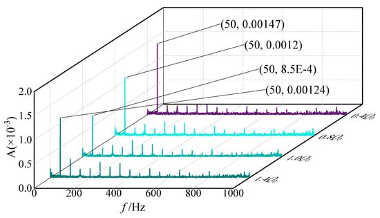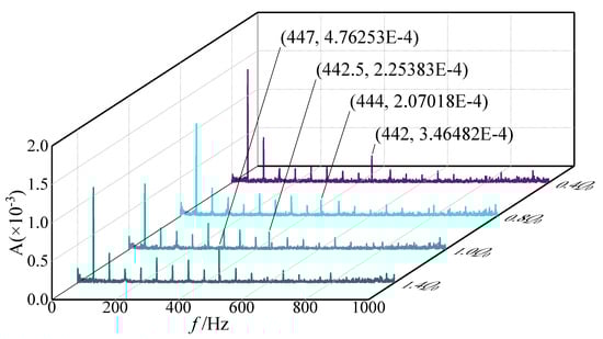The frequency spectrum of normal bearings operating under the four different conditions is primarily dominated by the rotation frequency, with a small peak at double the frequency of the rotation frequency. The peak pattern observed in the frequency domain analysis is consistent with that of the time domain analysis, with the fundamental frequency amplitude being most prominent during off-duty conditions. On the other hand, the faulty bearing’s frequency is not only prominent at the one-fold frequency position but also accompanied by frequencies that are two, three, and four times higher. This indicates that centrifugal pump failure leads to a significant increase in frequency multipliers. To determine the location of the faulty bearing’s damage, it is necessary to calculate its fault characteristic frequency. The calculated fault characteristic frequency for the bearing’s outer ring is 445.61 Hz. Comparing this with Figure 7, it is evident that the amplitude of the 0.4Q0 working condition is most prominent at 442 Hz, the 0.8Q0 working condition’s amplitude is most prominent at 444 Hz, the 1.0Q0 working condition’s amplitude is most prominent at 442.5 Hz, and the 1.4Q0 working condition’s amplitude is most prominent at 447 Hz. These results suggest that all four working conditions are near the fault frequency value of the bearing’s outer ring, indicating that the outer ring is faulty. Comparing the frequency-domain graph under normal and faulty conditions, it is evident that the frequency amplitude generally increases during the faulty condition and is accompanied by a prominent double frequency, with significant differences observed in the frequency domain. Therefore, frequency-domain analysis can effectively detect centrifugal pump bearing damage; its characteristics can be used as input for network models to predict the remaining life of the bearing.