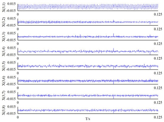 The normal bearing operating under the 1.0Q0 working condition was subjected to wavelet packet decomposition, and the resulting time-domain diagram of the eight frequency bands is presented in Figure 8. The X (3, 1) frequency band exhibited a higher and denser amplitude compared to other frequency bands, indicating that the energy density of normal bearings is higher in the low-frequency band.