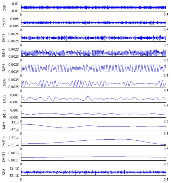 Figure 9 displays the results of the CEEMDAN decomposition performed on data collected under the normal bearing working condition (1.0Q0). CEEMDAN was able to divide non-stationary and nonlinear data into multiple intrinsic mode functions (IMFs) with a single feature. A total of 11 IMF components and 1 residual item (RES) were decomposed, with each IMF component exhibiting relatively independent characteristics and no modal stacking phenomenon, resulting in good recognition performance. IMF1 and IMF2 contained more data points and larger amplitudes, while the trends of IMF8, IMF9, and IMF10 were similar, with amplitudes gradually decreasing until the trend of IMF11 showed a monotonous trend, indicating the end of decomposition.