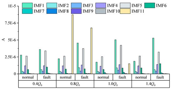 To further analyze the difference between normal and faulty bearing signals of centrifugal pumps operating under different conditions in the CEEMDAN decomposition, the energy characteristics of the IMF components of each layer were extracted for comparative analysis. This was performed on both normal and faulty bearings under different working conditions. The results are presented in Figure 10.