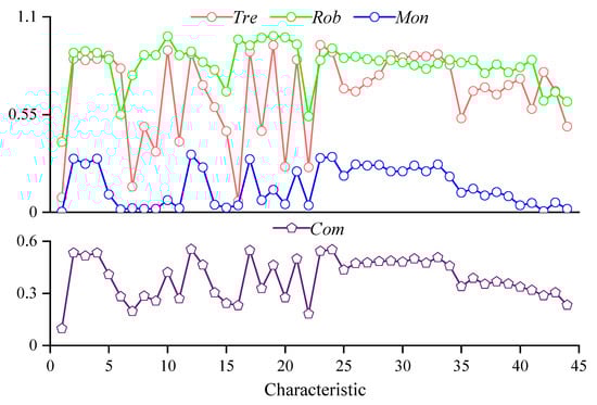 Based on the above analysis, we extracted a total of forty-three features, including eleven time-domain features, thirteen frequency-domain features, eight energy features derived from wavelet packet decomposition, and eleven energy features derived from the CEEMDAN decomposition. For each feature, its trend and robustness were calculated, and a monotonicity score was assigned. We then computed the comprehensive index score by adding the weighted scores of each feature. Finally, we plotted line charts for the trend score (Tre), robustness score (Rob), monotonicity score (Mon), and comprehensive index score (Com) of the 43 features, as shown in Figure 12.