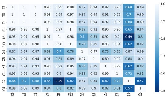 From the table, we can see the trend, robustness, and monotonic scores of the preferred features, but they cannot reflect the correlation between features. To do this, the correlation coefficient between the features is calculated, and the expression is as follows: