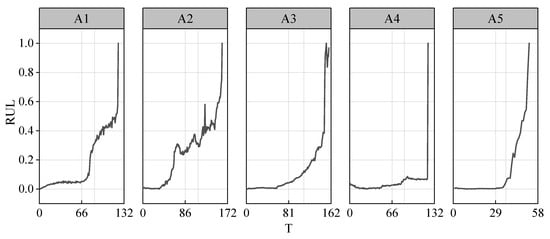 Based on the aforementioned analysis, it is evident that the preferred features possess certain advantages in terms of trend, robustness, and monotonicity. Furthermore, each feature maintains a certain degree of independence while exhibiting a strong correlation with time, thereby satisfying the criteria for feature screening and facilitating subsequent feature fusion. To reduce the dimensionality of the selected 12 features, we performed KPCA based on the aforementioned steps and obtained single-dimensional data. To enhance the prediction accuracy and standardize the data, we normalized the data. The resulting XJTU-SY dataset obtained under unified working conditions for the five rolling degradation samples of the bearings is illustrated in Figure 14.