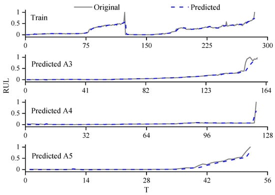 Figure 15 is the effect diagram of training and prediction, in which Train reflects the training situation of the LSTM network for A1 and A2 working condition data. Predicted A3, A4, and A5 reflect the prediction of the sample.