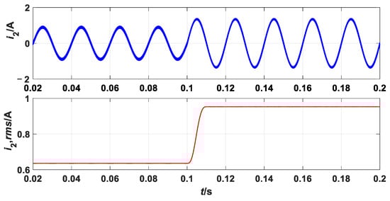 To identify the efficacy of the instantaneous response characteristic of the system, the simulation is carried out as the reference current increases by 50% at t = 0.1 s. The parameters used are as shown in Table 1, while kp = 4.5. The inductor current and its root mean square are shown in Figure 3. It can be seen that the inductor current follows the increase in the reference current value smoothly without overshooting, and the duration of the transition process is less than 0.01 s, which reflects the fine transient characteristics of the system.