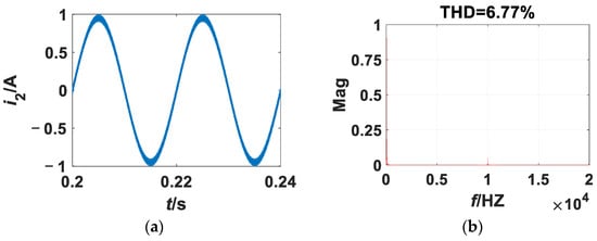 When kp = 4.5, the operation state of the system is shown in Figure 4. In Figure 4a, it can be seen that the peak value of the inductor current i2 is 1A and the line frequency is 50 Hz, which shows that the output current follows the reference current. In this situation, the time domain waveforms of the inductor current i2 are smooth, which means that the system operates in a stable station. Figure 4b shows that the inverter only generates harmonics at 1 k Hz, which is just the switching frequency, and the total harmonic distortion (THD) is 6.77%, which is permitted with the resistance load.