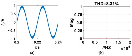 Keeping kp = 4.5 constant and taking Rf as the bifurcation parameter, the influence of the damping resistance Rf on the system stability is analyzed. The simulation results for the case where Rf = 4.2 Ω are shown in Figure 5. Figure 7a,b show the time domain waveform of inductor current iL and its FFT, respectively. It can be seen from Figure 7a that the inductor current i2 does not oscillate and the waveform keeps consistent with the reference current so that the system operates in stable operation. As can be seen in Figure 7b, the system exhibits harmonics only at the switching frequency, which is similar to Figure 4b, also indicating a steady state operation; the THD value is 6.89% in this situation.