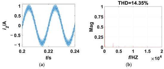 With the increase in kp, the low-frequency oscillation becomes more serious. As kp continues to increase to 4.74, the time domain waveform of inductor current i2 is shown in Figure 6a. It can be seen that the oscillation amplitude of the inductor current i2 on the line cycle increases obviously, and the system works in an unstable state. Figure 6b is the frequency spectrum of inductor current i2. Compared with Figure 5b, it can be found that the peak value of the low-frequency oscillation increases obviously, and the oscillation frequency is about 2.96 kHz. With the increasing oscillation, the THD value reaches 14.35%.