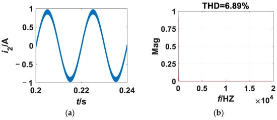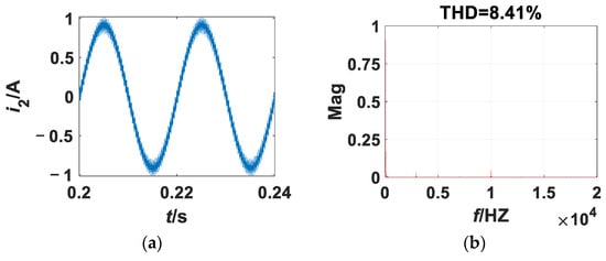 When Rf is reduced to 4.095 Ω, the inductor current i2 loses its stability and oscillates slightly in the entire line cycle, as shown in Figure 8a, and the electromagnetic noise may arise here. Although the oscillation amplitude is relatively small, the THD value increases to 8.41%, as shown in Figure 8b. Furthermore, it can be seen in Figure 8b that the oscillation frequency is about 2.9 kHz, which is far from the switching frequency, indicating that the circuit enters into low-frequency oscillation from a stable state as the damping resistor Rf varies.