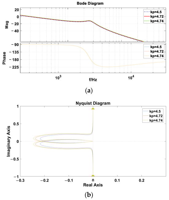 When the damping resistance Rf = 4.3 Ω, the analysis results are as shown in Figure 10 as kp varies. It can be seen in Figure 10a that the phase curve does not intersect with the −180 point when the amplitude curve gain is higher than 0 dB, which means that the system keeps stable as kp varies. There is also no open-loop right half-plane pole, as shown in Figure 11b. According to the Nyquist stability criterion, the outputs under different conditions are all shown to be stable.