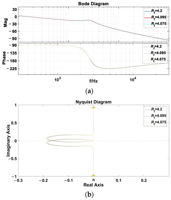 To keep consistency with the simulations in Section 3.2, the same values specified in Table 1 are used. According to Equation (7), the bode plot and Nyquist curve under different conditions can be found in Figure 10 and Figure 11, respectively.