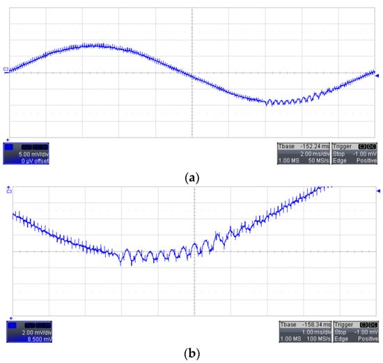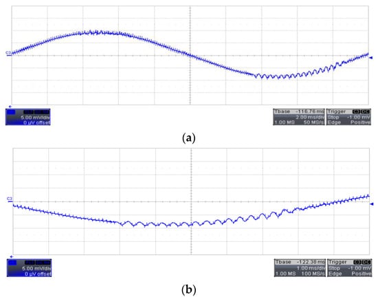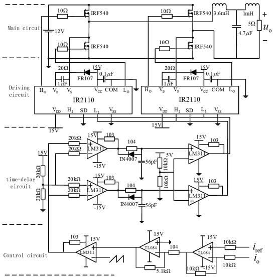 In order to verify the observed slow-scale bifurcation and the theoretical analysis above, an experimental circuit of a single-phase full-bridge voltage source inverter with an LCL filter is built, and the same circuit parameters in simulations shown in Section 3 are adopted. The experimental schematic diagram, which contains the main circuit, drive circuit, time delay circuit, and control circuit, is shown in Figure 13, in which the power switch and the driver are IRF540 (minos, Shenzhen, China) and IR2110 (Infineon, Munich, Germany), respectively. In addition, a Teledyne LeCroy oscilloscope (Teledyne LeCroy, New York, NY, USA) and Tektronix A622 current probe (Tektronix, Johnston, IA, USA) are used to capture the measured waveforms.
