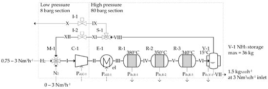 | Two lower and four higher molar hydrogen to nitrogen inlet ratios of stream H2 to N2 than the design case (2.8, 2.9, 2.99, 3.01, 3.02, and 3.03 vs. 2.96 molH2 h−1/molN2 h−1) emulate a faulty inlet flow control. | |
