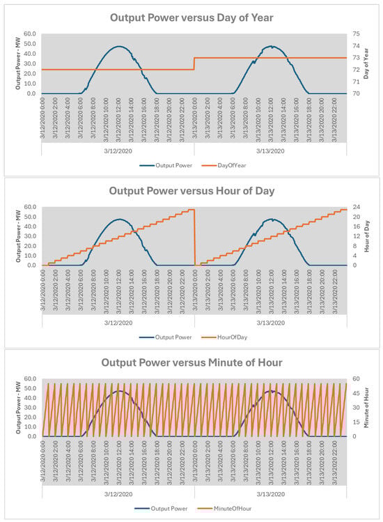 As shown in Figure 1 below, when analyzing the use of such temporal indicators in forecasting, input signals with a sawtooth waveform appear, while the output power profile of solar systems typically follows a bell-shaped curve. It can be noticed that the temporal indicators change in a linear form while the output power changes in a nonlinear form, which might cause a reduction in efficiency when these inputs are chosen for training to build a model to forecast the output power.