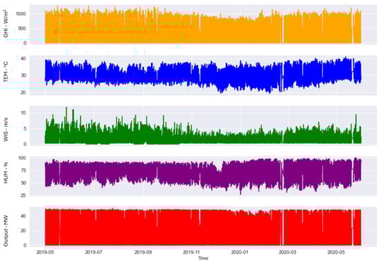 The dataset is derived from a 48MWAC solar power facility situated in Vietnam, spanning from May 2019 to the end of May 2020. The information obtained via the plant’s metering system encompasses the power generated by the facility, denoted as P in [MW]; solar radiation, referred to as GHI in [W/m2]; ambient temperature, indicated as TEMP in [°C]; WIND [m/s] is wind velocity at the power plant location; and HUM [%] is relative humidity at the plant site. The data possesses a granularity of 5 min, wherein each data point within the dataset represents the average measurement over a 5 min interval for each of the mentioned parameters. The comprehensive dataset is effectively illustrated in Figure 2.