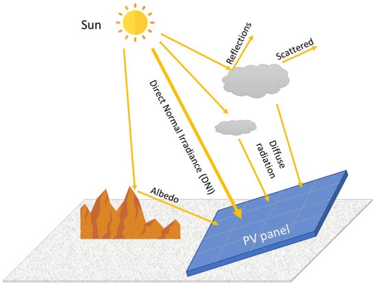 The overall synthesized radiation received by the surface of the solar panel consists of DNI, Diffuse Radiation, and Albedo, forming the GHI measured in W/m2.