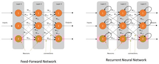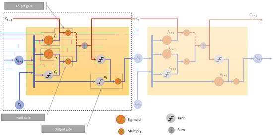 The Long Short-Term Memory (LSTM) is a distinctive type of Recurrent Neural Network (RNN) capable of capturing both short-term and long-term dependencies []. Unlike feed-forward networks, RNNs are designed to capture the variability of data over time. This variability is managed through feedback loops that affect the architecture of an RNN. For these networks, the number of neurons depends on the number of past sample data points used to make the prediction. Information only flows in one direction in a feed-forward neural network: from the input layer to the output layer via the hidden layers. The data flows directly across the network.