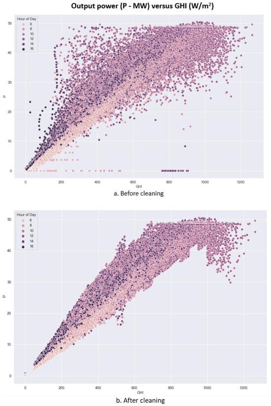 The paper [] conducts a case study on forecasting using RF (Random Forest), SVR (Support Vector Regressor), CNN (Convolutional neural network), LSTM (Long Short-Term Memory), and Hybrid models. The training dataset configurations include (1) Raw data (Global Horizontal Irradiance, temperature, humidity, wind speed, etc.), (2) Extended data consisting of raw data and computed data derived from the raw data, (3) Original data supplemented with extended computed data and the addition of Hour of the Day as an indicator for time. The conclusion drawn is that the third data set yields the best results, demonstrating the significance of enhancing forecasts by including the Hour of the Day indicator. The supplementation of temporal indicators was also carried out by the authors in []. The study incorporated not only Hour of the Day but also the inputs Day of the Year and Minute of the Hour to develop a highly accurate forecasting model.