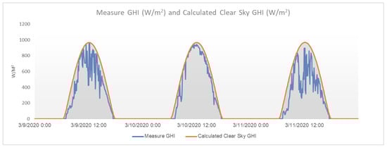 Clear sky solar radiation refers to the amount of solar radiation that reaches the Earth’s surface under unobstructed, cloud-free conditions. It represents the maximum potential solar radiation that can be received at a specific location on Earth. Calculating clear sky solar radiation at a solar power plant installation site involves employing various models and methods []. The research [] presents a comparative assessment of various models. Some notable models include:
