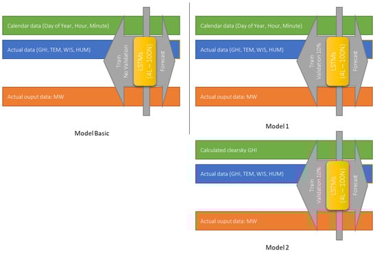According to [], the authors conducted experiments using data from an industrial-scale solar power plant and developed an approach utilizing the LSTM artificial neural network, along with methods for parameter selection. In this study, we replicated these experimental conditions and introduced new alternative inputs for temporal data. Figure 8 details the configurations for training the three models using the same training data: Basic Model, Model 1, and Model 2. The Basic Model is the one proposed in [], while Model 1 and Model 2 are tested in this work. Table 2 illustrates the actual measured data used during the experimental process. Details of the data employed for model training and forecasting are presented in Table 3.