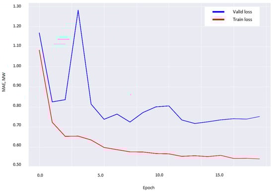 Figure 9 and Figure 10 show the loss (Mean Absolute Error, MAE) during the training of Model 1 and Model 2. In these figures, “Train loss” represents the loss (MAE) during the training phase of the models, while “Valid loss” represents the loss during the validation phase []. The comparison of prediction errors on the test set is reported in Table 4.