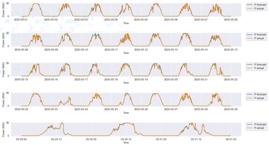 Figure 11 illustrates the error distributions on the test set among the forecast results of the models. The detailed power outputs of each 5 min interval of the measured value and forecast value from Model 2 are as in Figure 12.