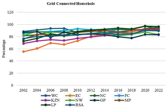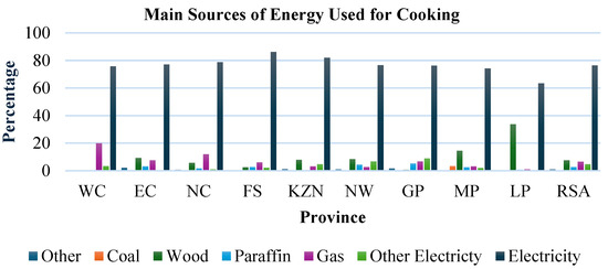 In South Africa, coal-fired facilities provide approximately 78% of the power [4], the majority of which were built during the apartheid era in the 1960s and 1970s. As a result of utilizing coal, South Africa ranks seventh in terms of per capita carbon dioxide emissions globally and accounts for approximately 40% of carbon dioxide emissions in Africa [5]. Load shedding is currently a problem in South Africa due to aging infrastructure and corruption in coal purchasing and power plant procurement, which has resulted to Eskom’s (South African utility supply) USD 24 billion debt. Addressing the growing demand for power is a major challenge due to the high cost and greenhouse gas emissions associated with traditional energy sources. Increasing the use of renewable energy systems can assist to reduce carbon emissions caused by greenhouse gases. There are several problems with electric power generation, transmission of power from the generating station to the user, and subsequently distribution in rural areas because of the increasing prices. How people in rural areas adjust during energy crises is a crucial issue that should not be overlooked. Energy poverty is common in rural areas, characterized as a lack of energy supplies to meet the associated human energy demand. In terms of cost, energy poverty refers to a situation in which people are unable to acquire electricity from traditional or modern sources. The percentage of South African houses connected to the grid increased from 76.7% in 2002 to 89.6% by 2022. Figure 1 shows the percentage distribution of households that are connected to Eskom Grid [6]. However, rural low-income households are having a difficult time meeting their energy needs. Non-electrified households rely on filthy energy sources. Figure 2 shows the percentage distribution of the main sources of energy used for cooking by province in 2022, extracted in [6]. The figure illustrates that the percentage of households using electricity for cooking increased from 57.5% in 2002 to 76.5% in 2022. This increase was matched by an increase in the percentage of families using alternate sources of electricity, such as generators. This type of energy for cooking increased from 1.2% in 2014 to 7.8% in 2019, before declining to 4.8% in 2022. This form of energy for cooking rose from 1.2% in 2014 to 7.8% in 2019, before falling to 4.8% in 2022. The percentage of houses that used gas (mostly standard Liquefied Petroleum Gas) also rose from 2.2% in 2002 to 6.7% in 2022. Since 2002, there has been a significant drop in the use of paraffin, coal, and firewood. The percentage of homes that used paraffin collapsed from 16.1% in 2002 to 2.8% in 2022, while the percentage of households that used firewood decreased from 20% to 7.7%. The number of families who uses electricity as their primary source of energy for cooking is the highest in the Free State (86.2%) and KwaZulu-Natal (82.0%), and lowest in Limpopo (63.5%). Other sources of electricity (such as generators) are the most common in Gauteng (9.0%) and Northwest (6.8%). Paraffin is the most used in Gauteng (5.3%), with the Western Cape having the lowest utilization (0.2%). The usage of wood and coal remained most notable in Limpopo (34.0%), Mpumalanga (18.0%), the Eastern Cape (9.3%), the North-West (8.4%), and KwaZulu-Natal (8.2%). In the Western Cape and Gauteng, less than 1% of families utilized wood to cook (0.5% and 0.7%, respectively). Gas is the most used by households in the Western Cape (19.9%) and Northern Cape (12.0%). South Africa’s power network consists primarily of major power facilities located inland near Gauteng’s mining cities and industrial sectors. They have an extensive transmission infrastructure to reach the coastline.