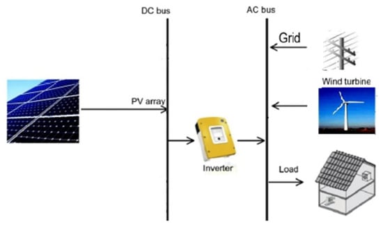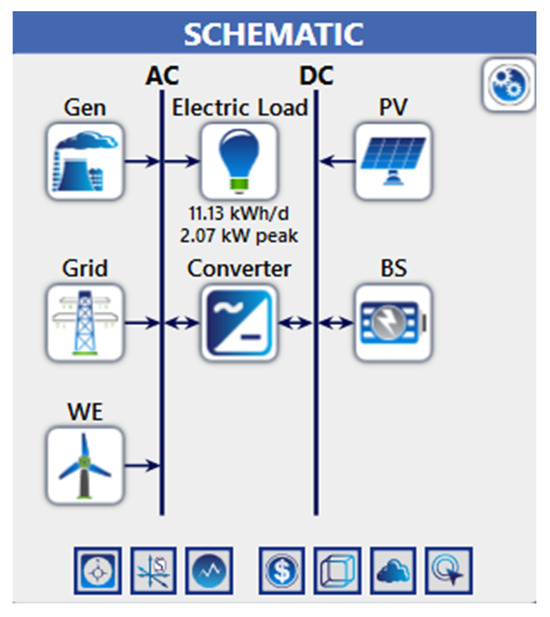Diagram of a hybrid renewable energy system connected to the grid.