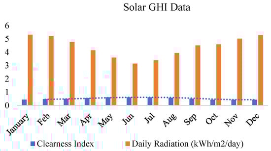 The basic flat plate PV with a 12 kW capacity that is being studied cost ZAR 125,000 in capital and replacement costs and ZAR 3000 in operating and maintenance costs annually. A life expectancy of 25 years and an 80% de-rating factor were considered. The clearness index shows monthly average global radiation statistics from National Aeronautics and Space Administration (NASA) using geographic coordinate information. Figure 13 shows the monthly average solar global horizontal irradiance data.