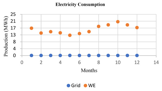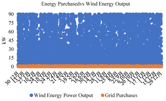 A variety of system configurations eliminated the infeasible ones, ranked the feasible ones according to total net present cost, and selected the feasible one with the lowest total net present cost as the optimal system configuration. The optimization process identified the best possible, or optimal, system configuration that satisfied the constraints at the lowest total net present cost as shown in Table 1. When integrating a 90 kW wind generation capacity into the current grid system, the proposed configuration proved to be the most efficient among all alternatives. It exhibited the lowest net present cost (NPC) and levelized cost of energy (LCO) while also minimizing energy purchases from the grid and maximizing energy sales to the grid, as shown in Table 1. The power generation from this optimized, cost-effective system is depicted in Figure 15. The alternative that ranked just below the top choice involved integrating photovoltaic (PV) solar energy with the grid, which exhibited a lower net present cost (NPC) and levelized cost of energy (LCO) compared to wind energy. However, the energy pricing differed slightly from the existing system, and the amount purchased from the grid was higher in comparison to the wind energy/grid configuration. The decision regarding the most appropriate design will ultimately rest with the designer, who must consider the specific site and design constraints. This situation results in a minimal amount of energy being sold back to the grid, necessitating a thorough investigation to address the issue.