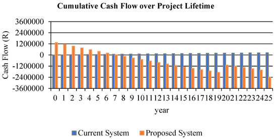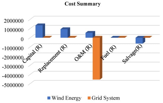In this system, the amount of energy purchased from the grid is very low, as shown in Figure 16. This results in more excessive power produced by the wind, which is sold to the grid which resulted in the less amount of power purchased from the grid. Table 2 shows the systems electrical outputs. The findings indicate that the proposed system can meet the demand load with an annual electricity production of approximately 191,360 kWh. When the maximum renewable percentage reaches 100%, the renewable fraction stands at 99.7%. Consequently, the surplus power sold to the grid amounts to 187,297 kWh per year, representing 98% of the electricity sold to the grid derived from renewable energy sources. This achievement significantly decreases the energy purchased from the grid and lowers the overall electricity costs. The cost summary for the optimized system is displayed in Figure 17, while Figure 18 provides a depiction of a cash flow analysis.