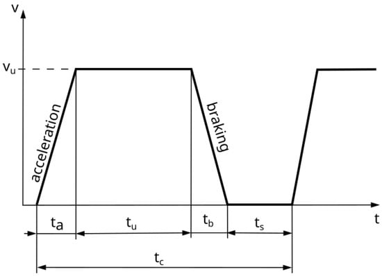 Theoretical driving cycle between stops (ta—acceleration time, tu—steady-state motion time, tb—braking time, ts—stop time, tc—cycle time).
